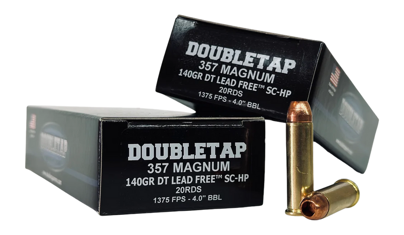 DoubleTap 357 Magnum ammunition loaded with 140-grain solid copper hollow point bullets, delivering 1375 fps velocity from a 4-inch barrel with 587 ft-lbs of energy. Lead-free construction provides virtually no muzzle flash, making it suitable for both self-defense and hunting applications with 19-inch penetration and approximately 0.71-inch expansion in 10% gelatin.