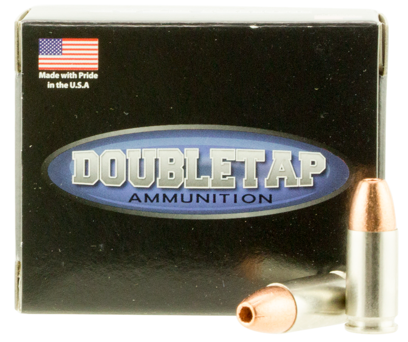 DoubleTap 9mm Luger ammunition loaded with 77-grain lead-free solid copper hollow point bullets, delivering 1600 fps muzzle velocity and 437-438 ft-lbs energy. Designed for home defense and concealed carry applications with controlled penetration to minimize overpenetration risk. Brass casing, 20 rounds per box.