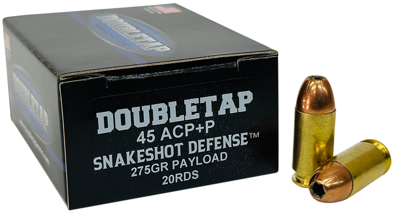 DoubleTap 45 ACP +P Snake Shot ammunition delivers a hybrid payload combining a 185gr JHP bullet with #9 shot pellets for versatile defensive and varmint use. The load penetrates 10-12 inches in gel with expansion to .70 inch, making it effective for home defense and snake/varmint elimination. Packaged in boxes of 20 rounds with brass cases.