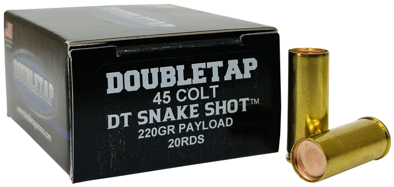 DoubleTap SnakeShot is a 45 Colt handgun round loaded with #9 shot and a hardcast full wadcutter, delivering 1000 fps velocity for controlled patterns from revolvers. The hardcast wadcutter penetrates while the #9 shot provides predictable spread without excessive rifling-induced scatter. Sold in 20-round boxes.
