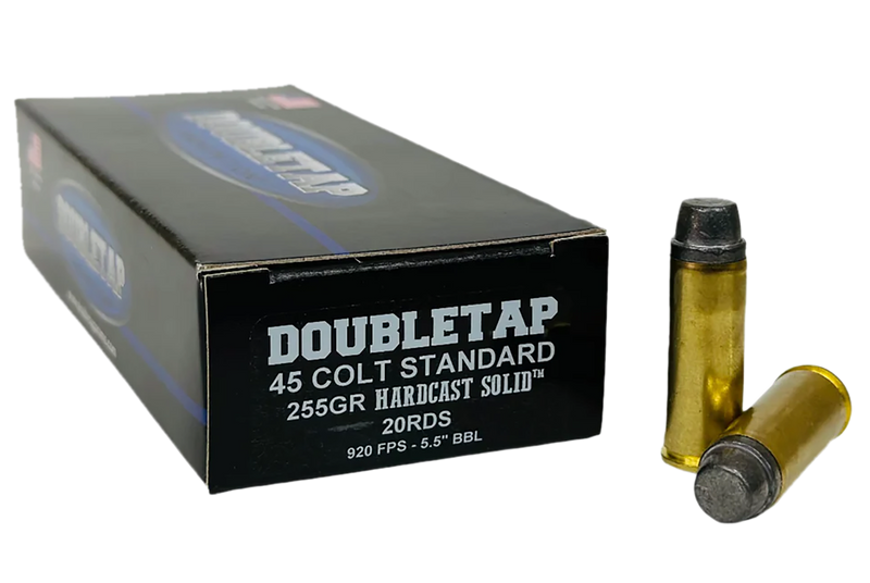 DoubleTap .45 Colt ammunition loaded with 255-grain Keith-style semi-wadcutter hardcast bullets designed for deep penetration and hunting applications. This standard pressure load delivers 975 fps muzzle velocity and 511 ft-lbs energy from a 7.5" barrel, making it suitable for revolvers including the Taurus Judge. Each box contains 20 rounds of brass-cased ammunition.