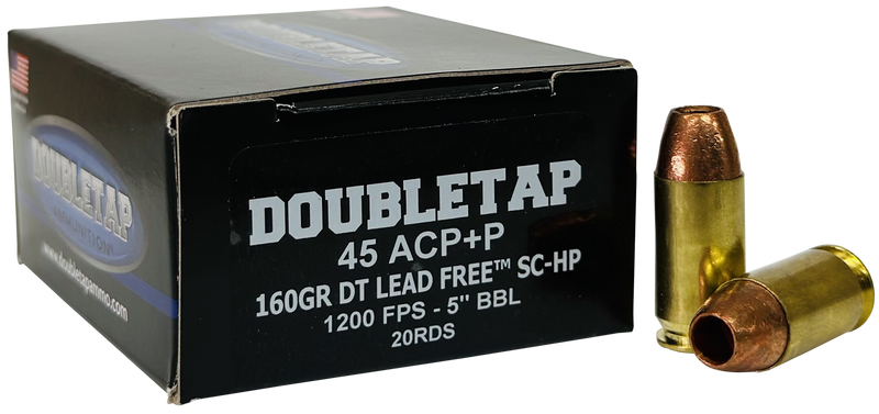 DoubleTap Ammunition 45 ACP round featuring a 160 grain lead-free hollow point bullet with a muzzle velocity of 1050 fps and muzzle energy of 392 ft-lbs. Supplied in boxes of 20 rounds, cases contain 50 boxes. This ammunition is hazmat-rated for both ground and air shipping.