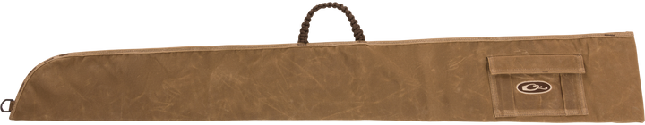 This Drake Waterfowl wax canvas gun sleeve is designed to protect shotguns with exterior dimensions of 19.3" L x 8.6" W x 1.5" H. Features include an exterior choke tube pocket, carry rope handle, and velcro closure for secure transport and storage.