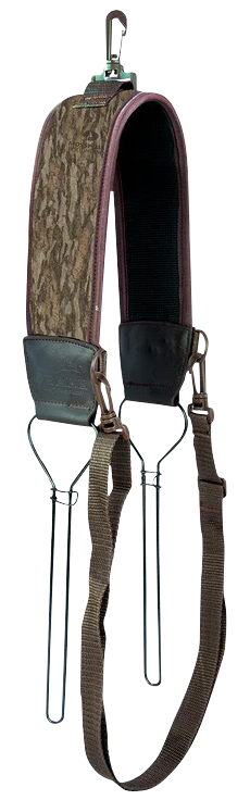 This over-the-shoulder game tote is designed to hold waterfowl during hunting trips, featuring a neoprene construction with a comfortable neoprene shoulder strap and waist strap for secure carrying. The tote includes 2 wire loops for hanging birds and measures 18.2" long by 5.9" wide by 2.0" deep. The Mossy Oak Bottomland camouflage pattern provides effective concealment in natural hunting environments.