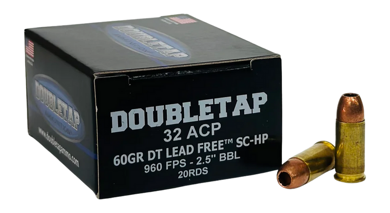DoubleTap Ammunition 32 ACP centerfire handgun ammunition loaded with 60 grain solid copper hollow point projectiles. This lead-free round comes in a 20-round box and is designed for reliable performance in 32 ACP handguns.