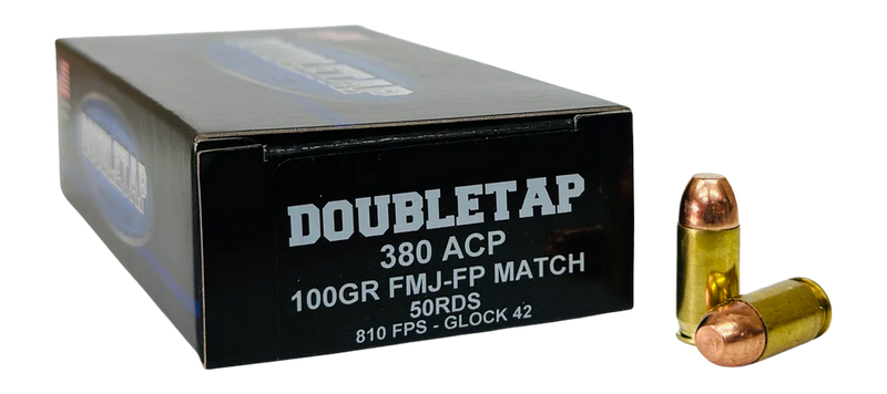 DoubleTap Ammunition 380 ACP loaded with 100-grain full metal jacket flat point bullets. This round is packaged as 50 rounds per box, 20 boxes per case. Suitable for practice, training, and general shooting applications in .380 ACP pistols.