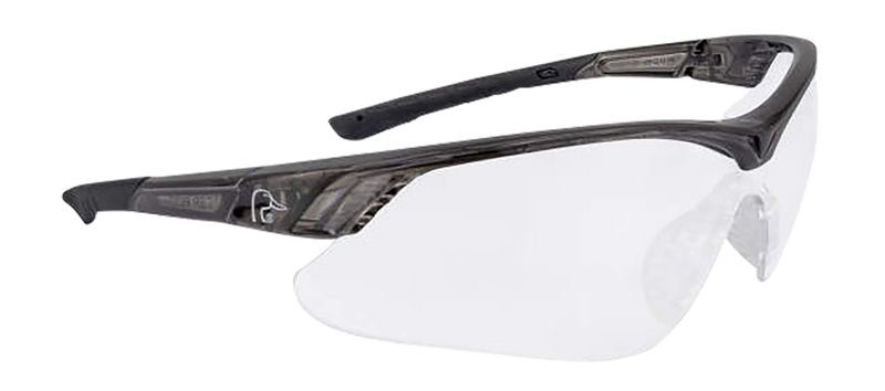 Half-frame shooting glasses with clear lenses designed for firearm use and outdoor shooting applications. Features a rubber nose piece for comfort and stability, with 99.9% UV protection. Black frame construction suitable for hunting and sport shooting.
