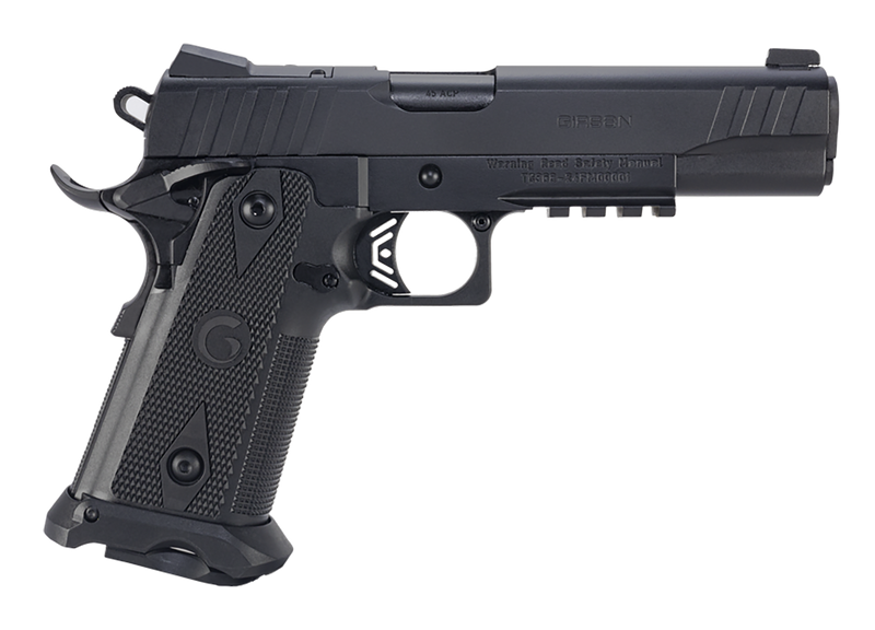 Single-action semi-automatic pistol chambered in 45 ACP with a 5" barrel and 11+1 round capacity. Features an optic-ready slide, extended beavertail, accessory rail, ambidextrous safety, and fiber optic front/adjustable rear sights. Steel frame with black polymer grips and checkered front strap.