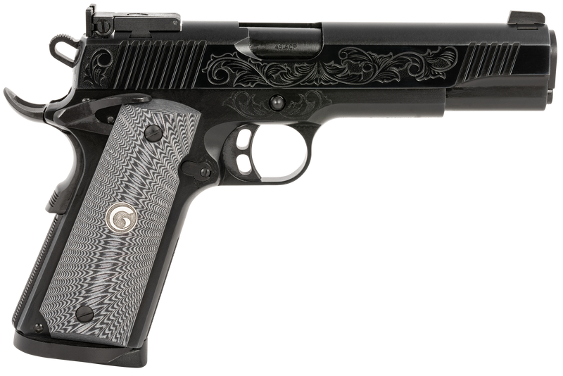 Single-action semi-auto pistol chambered in 45 ACP with a 5" barrel and 8+1 round capacity. Features a black chrome finish with engraved serrated slide and steel frame, extended beavertail, adjustable rear sights, and ambidextrous safety. Includes black/gray G10 grips and weighs 2.55 lbs.