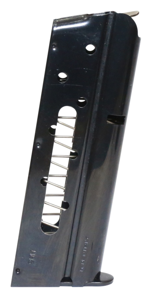This magazine is designed for the EAA Girsan MC1911SC Ultimate series 1911 pistols chambered in 45 ACP. It holds 6 rounds and features a steel construction with a visual capacity window for easy round count verification. The windowed design allows shooters to quickly see remaining ammunition capacity.