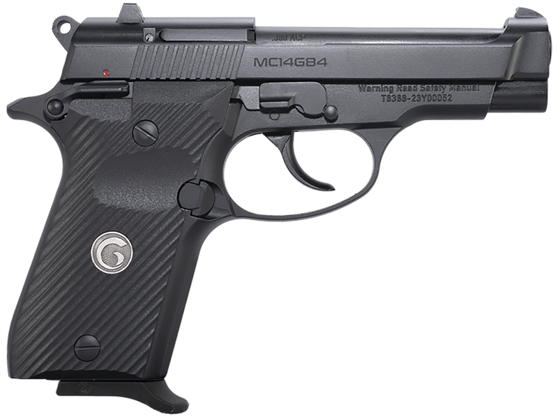 The Girsan MC14 G84 is a semi-automatic pistol chambered in .380 ACP with a 3.8-inch steel barrel and 13+1 round capacity. It features a black aluminum frame with beavertail, black serrated steel slide, black polymer grip, and fixed 3-dot sights. Designed for concealed carry with ambidextrous safety and double-action/single-action operation.