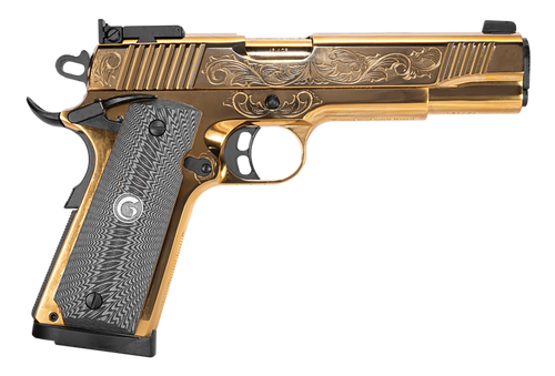 Single-action, recoil-operated semi-automatic pistol chambered in 45 ACP with a 5" barrel and 8+1 capacity. Features a full-size steel frame with polished chrome finish, ambidextrous thumb safety, extended beavertail, accessory rail, and pearl engraved grips. Includes Novak-style fixed sights and weighs approximately 2.55 lbs.