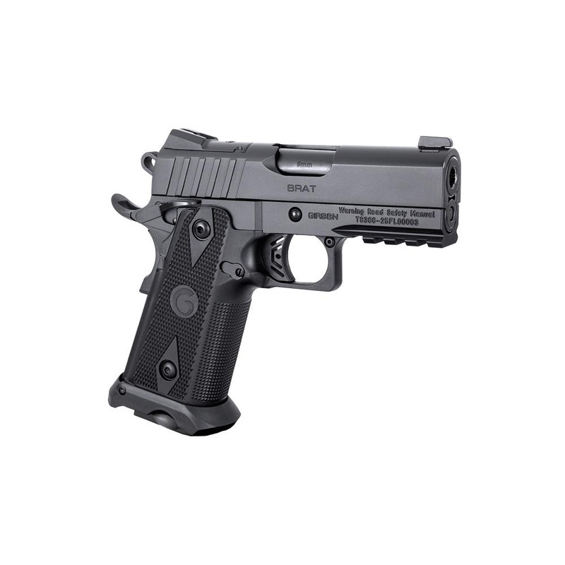 The Girsan Witness 2311 Brat is a compact 9mm semi-auto pistol with a 3.4" barrel, steel frame, and 17+1 round capacity designed for concealed carry. This optic-ready model features an accessory rail, extended beavertail grip safety, ambidextrous thumb safety, skeletonized hammer, and fixed white dot sights. The handgun weighs 1.4 lbs and measures 7.15" overall.