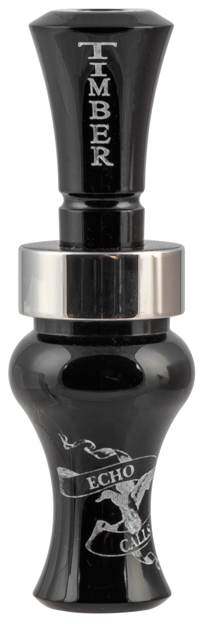 The Echo Calls Timber is a single reed duck call constructed from black acrylic, designed specifically to attract ducks with hail calls and raspy quack sounds. This non-electronic, hand-operated call measures 5.4" in length and produces mallard vocalizations, making it suitable for waterfowl hunting applications. The compact design and durable acrylic construction provide reliable performance in the field.