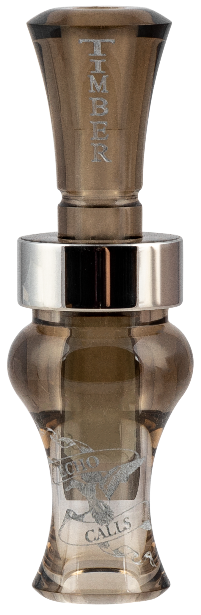 The Echo Calls Timber is a single reed duck call designed to produce authentic mallard hen sounds for attracting ducks during waterfowl hunting. Constructed from smoke gray acrylic material, this non-electronic call measures 5.0" in length and 2.0" in width and height. This accessory is ideal for hunters seeking a reliable, traditional game call for duck hunting applications.