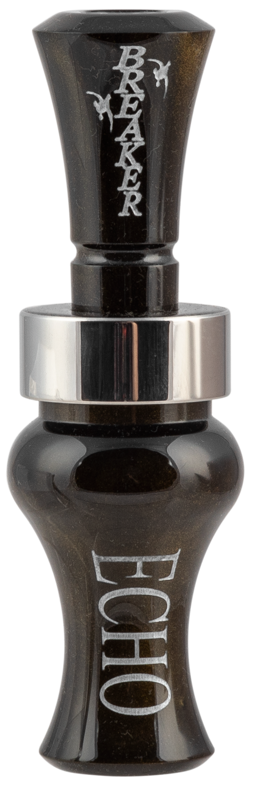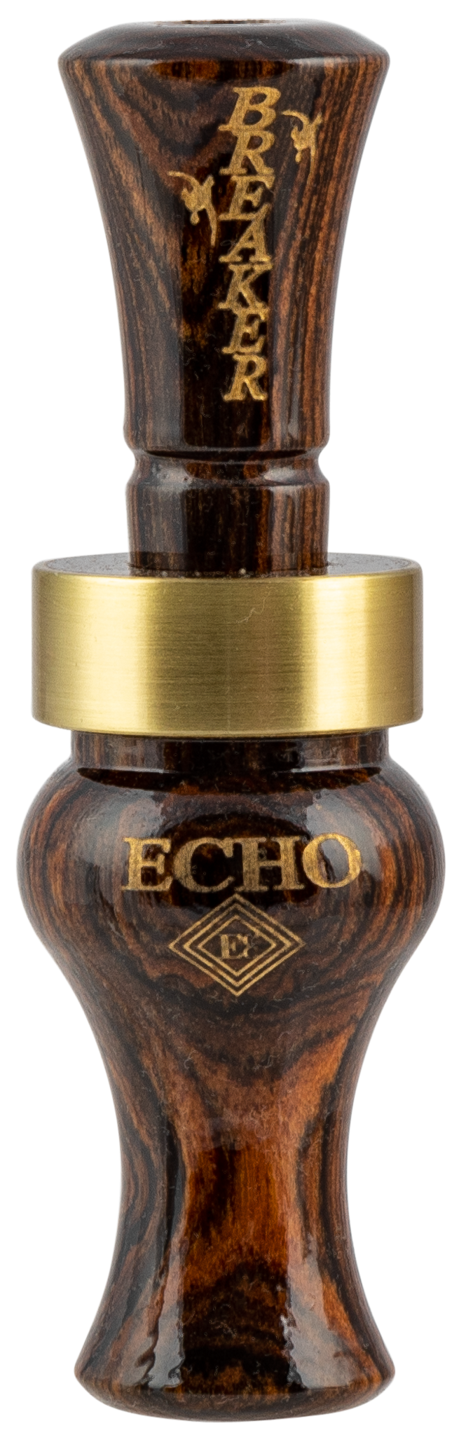 The Echo Calls Breaker is a single reed duck call designed to produce mallard hen sounds with a nasally rasp characteristic. Constructed from brown bocote timber, this non-electronic, hand-operated call is intended for waterfowl hunting to attract ducks. Dimensions are approximately 5.4" length x 1.9" width x 1.8" height.