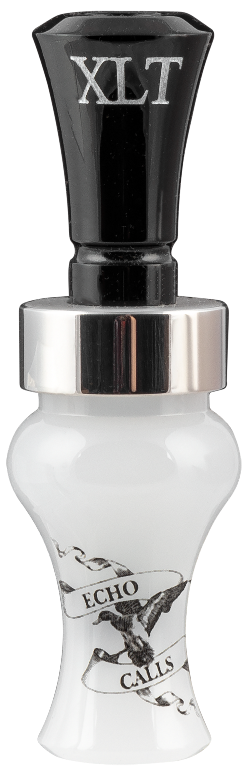 The Echo Calls XLT is a single reed mallard hen duck call constructed from black and pearl acrylic. This non-electronic, hand-operated call produces authentic mallard hen sounds to attract ducks during waterfowl hunting. Compact dimensions of 6.0" length x 2.0" width x 2.0" height make it portable for field use.