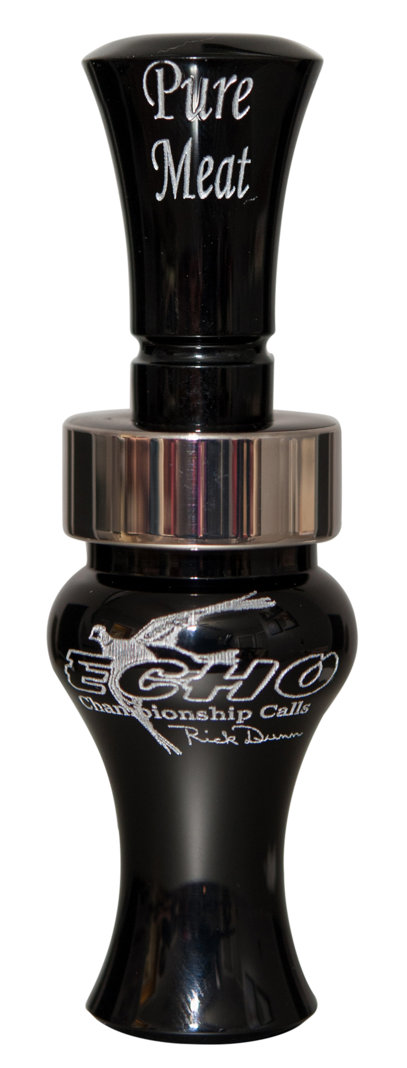 The Echo Calls Pure Meat is a double reed open call designed to produce mallard sounds including squeals and whines to attract ducks. Constructed from black acrylic material, this non-electronic, hand-operated game call measures 5.4" in length and is ideal for waterfowl hunting applications.