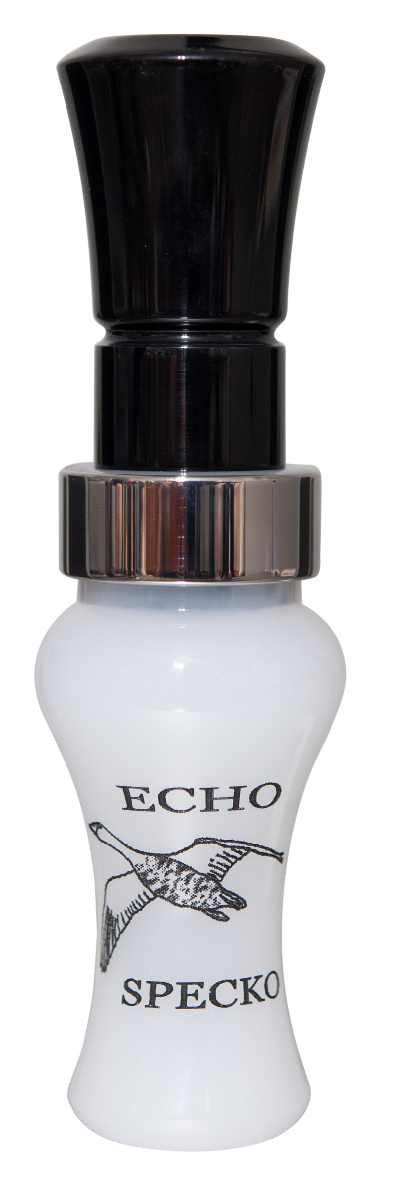 The Echo Calls Specko is an open call game call designed to attract specklebelly geese using hail calls and soft clucks. Constructed from black and pearl acrylic with dimensions of 5.4" long by 1.9" wide and 1.9" high, this non-electronic call is operated by hand. Ideal for waterfowl hunters targeting geese in the field.