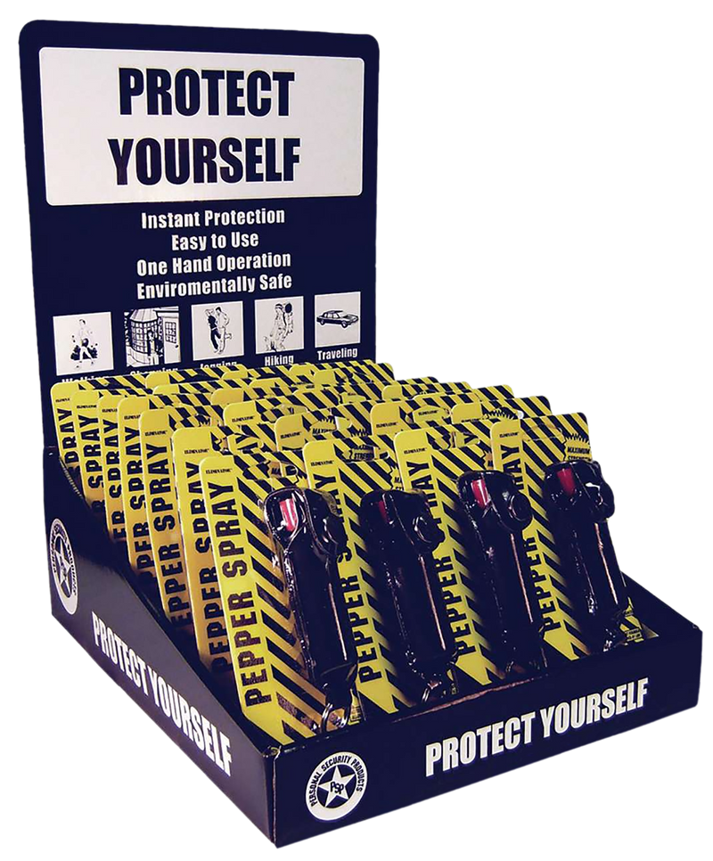 This counter display contains 16 units of Eliminator Spray pepper spray in lipstick case form, designed for personal protection. The display is designed for retail counter-top placement with dimensions of 13" x 10.50" x 7". Product is classified as hazmat and requires special handling for both ground and air shipment.