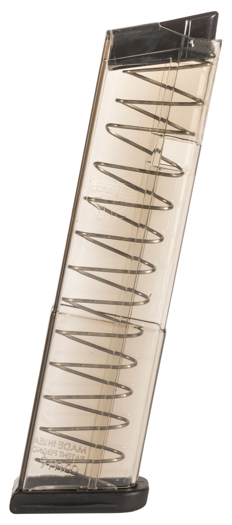 This is a 12-round extended polymer magazine designed for the Glock 43 in 9mm Luger. The carbon smoke finish magazine extends approximately 2 inches below the magwell and features an ergonomic floor plate for easy handling, extreme impact resistance, and lifetime warranty.