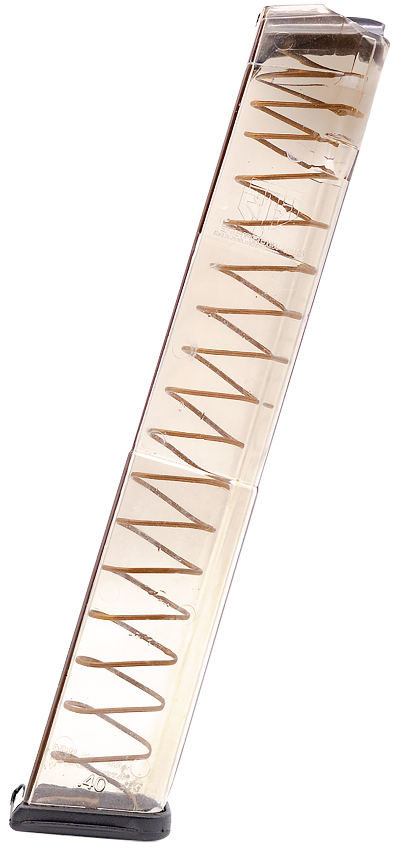 This 30-round magazine is chambered in .40 S&W and fits Glock models 22, 23, 24, 27, and 35 across generations 1-4. Constructed from durable clear polymer, it features an ergonomic floorplate design for easy magazine pouch retrieval and is compatible with both Glock and aftermarket baseplates.