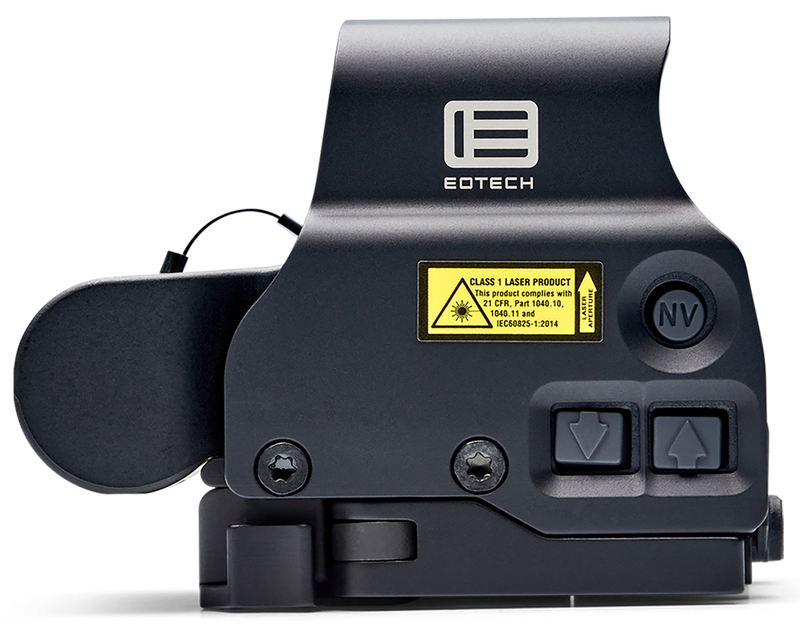 The Eotech EXPS3 is a 1x magnification holographic sight featuring a 1 MOA red dot reticle with illuminated display powered by CR123 batteries. It offers true two-eyes-open shooting, night vision compatibility, unlimited eye relief, and a quick detach mount compatible with Picatinny rails, with water resistance to 33 feet depth.