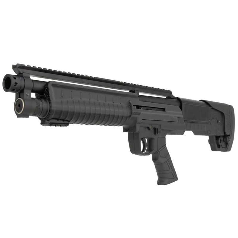 Semi-automatic bullpup shotgun chambered in .410 bore with 3" chamber and 18" barrel optimized for shot or slugs. Features a full-length Picatinny rail for optics, fixed cylinder choke, pop-up sights, and chrome-plated barrel with matte black finish. Designed for sporting, security, and law enforcement applications with ergonomic forend and pistol grip.