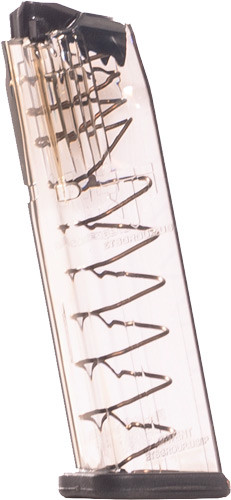 Magazine designed for Smith & Wesson M&P 9mm double-stack pistols with 17-round capacity. Features advanced polymer construction, ergonomic floor plate design for easy mag pouch retrieval, and interchangeable base plates compatible with other ETS 9mm double-stack magazines. Includes lifetime warranty.