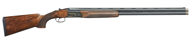 The F.A.I.R. Carrera V is a 20 gauge break-action over/under shotgun with a 30" ventilated rib barrel and 3" chamber, designed for versatile hunting and sport shooting. Features include a black receiver with gold inlay, adjustable comb walnut stock, and TechniChoke XP70 choke system for pattern customization. Weighs 7.5 lbs with overall length of 38.5" and adjustable trigger for personalized performance.