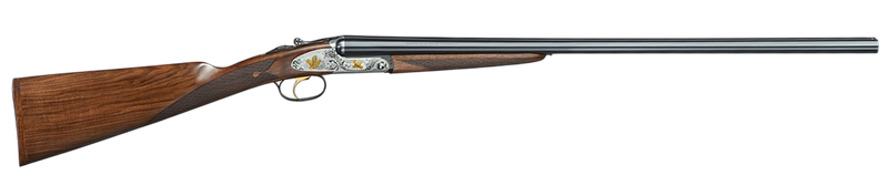 The F.A.I.R. Iside Select is a 12 Gauge break-action side-by-side shotgun with a 28" barrel and 2-round capacity. It features a polished silver receiver with gold inlay, English-style oiled walnut stock, and TechniChoke XP50 choke system. This shotgun weighs 6.60 lbs and measures 33" in overall length.