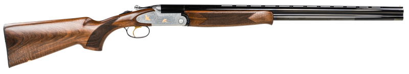 The F.A.I.R. SLX 692 Gold is a 20 gauge break-action over/under shotgun with a 28" ventilated rib barrel and 3" chamber capacity. Features a gold-engraved silver stainless steel receiver, fixed walnut stock, and weighs 6.94 lbs. Includes TechniChoke with TC XP50 5 chokes and tang safety.