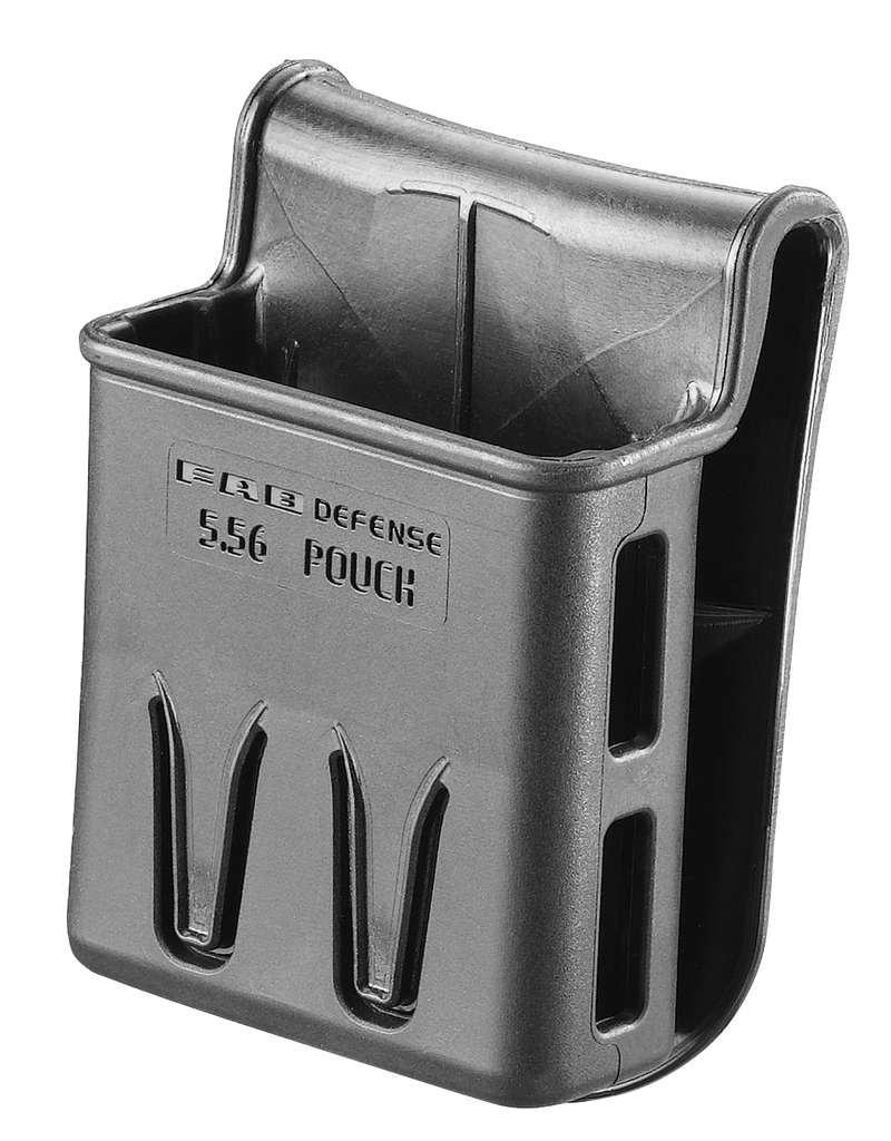 The FX556P is a belt-mounted magazine pouch designed to securely hold M16/M4/AR-15 style magazines with a unique click retention system that prevents accidental drops. Constructed from durable polymer, it features an ambidextrous paddle mount for left or right hip carry and enables quick magazine access during tactical operations. The pouch accommodates standard aluminum and steel magazines in 5.56 NATO caliber.