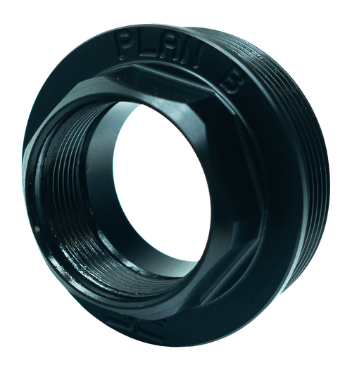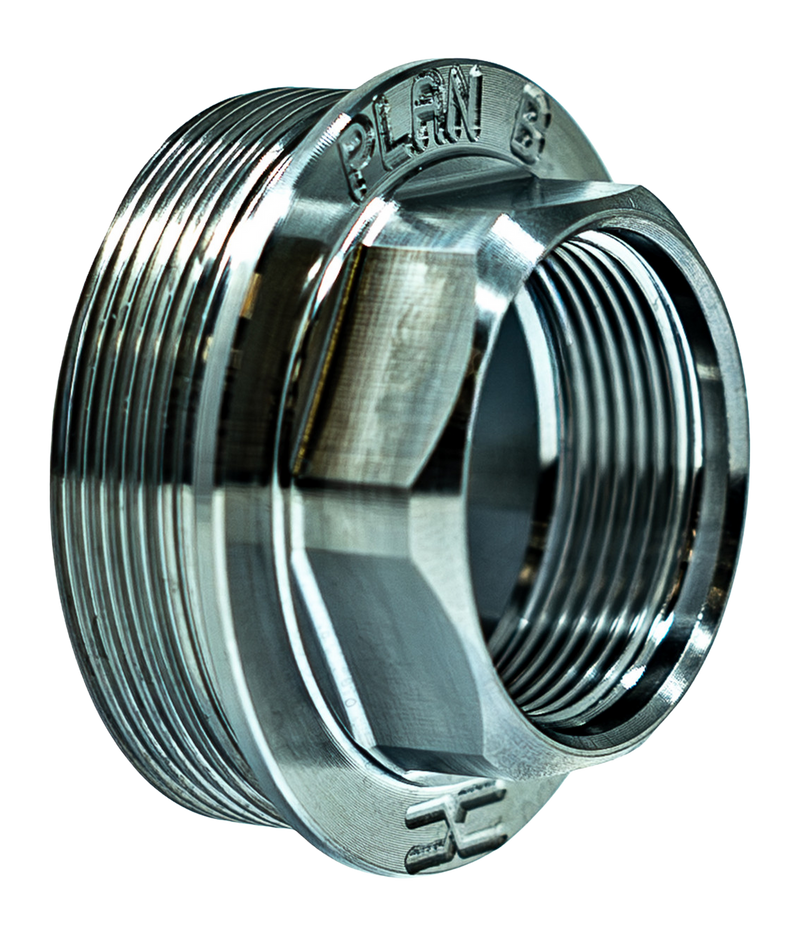This is a titanium adapter that connects a Plan B muzzle device to a hub-style mounting system with 1.375-24 thread pitch. The adapter is precision-manufactured from titanium for lightweight durability and corrosion resistance. Installation requires threading onto the compatible muzzle device.
