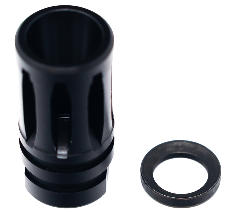 The Faxon Firearms A2 Flash Hider is a .30 caliber muzzle device featuring a black nitride finish and 5/8"x24 thread pitch for direct installation on compatible barrels. Designed to reduce muzzle flash signature during shooting. This classic A2-style flash hider is compatible with .308/7.62 platforms and modern AR-pattern rifles.