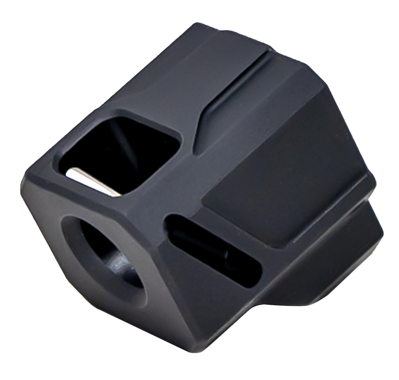 The EXOS-543 is a compensator designed for 9mm handguns with 1/2"x28 threaded barrels, featuring black anodized aluminum construction. It measures 1.10" in overall length and helps reduce muzzle rise during shooting. Direct thread installation onto compatible barrel threads.