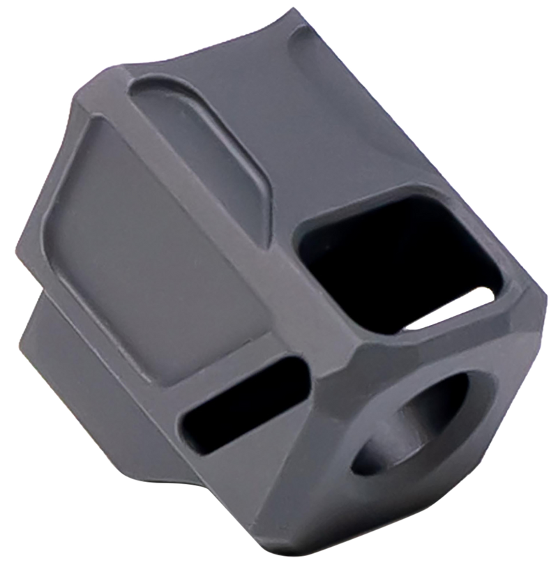 The Faxon EXOS-533 is a compensator designed for 9mm handguns, specifically compatible with Glock 43, 43X, and 48 models. Manufactured from 6061 aluminum with black anodized finish, it features 1/2"x28 threads and measures 1.218" in overall length. This muzzle device threads directly onto the barrel to reduce muzzle rise and recoil.