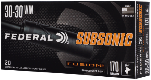 Federal 30-30 Winchester subsonic ammunition loaded with 170-grain soft point projectiles. This ammunition is designed for reduced velocity performance in the 30-30 Win cartridge, with 20 rounds per box.