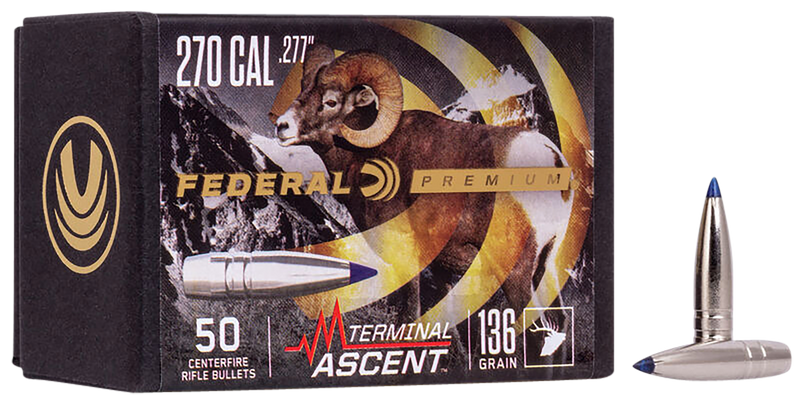 Federal Premium Terminal Ascent Component bullets are jacketed lead projectiles designed for .270 Winchester reloading applications. Each box contains 50 bullets with a 136-grain weight and .277" diameter, featuring a polymer tip for consistent ballistics. These components are intended for handloaders seeking premium accuracy and terminal performance.
