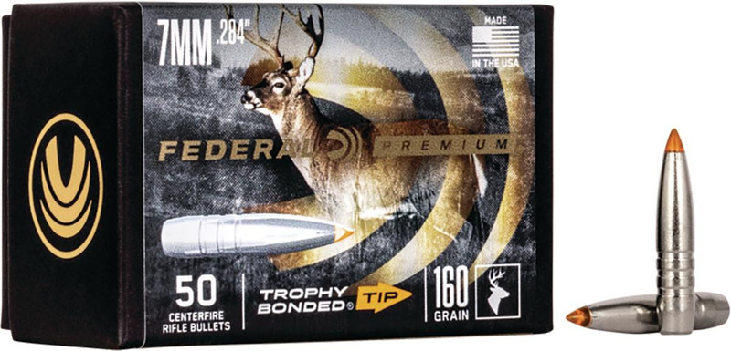Federal Trophy Bonded Tip bullets in .284 caliber (7mm) with 160 grain weight, designed for reloading rifle ammunition. These copper-jacketed projectiles feature a bonded core construction for reliable expansion and penetration. Sold in boxes of 50 rounds and are lead-free compliant.