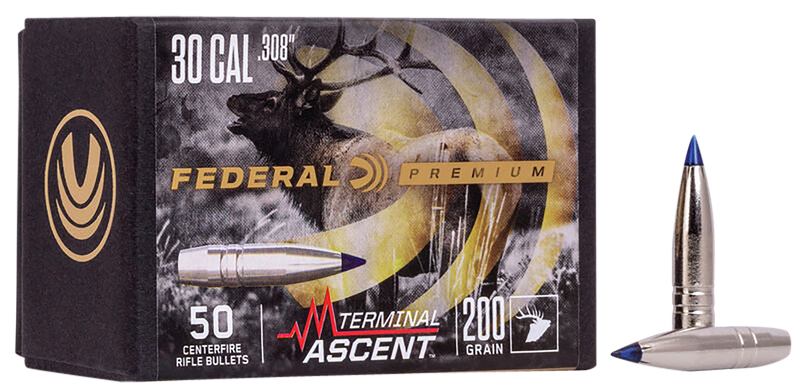 Federal Premium Terminal Ascent Component bullets are jacketed lead projectiles designed for .308 caliber reloading. Each box contains 50 bullets weighing 200 grains with a polymer tip and an overall length of 1.622 inches. These component bullets are intended for handloaders who want to assemble custom ammunition with Federal's Terminal Ascent bullet technology.
