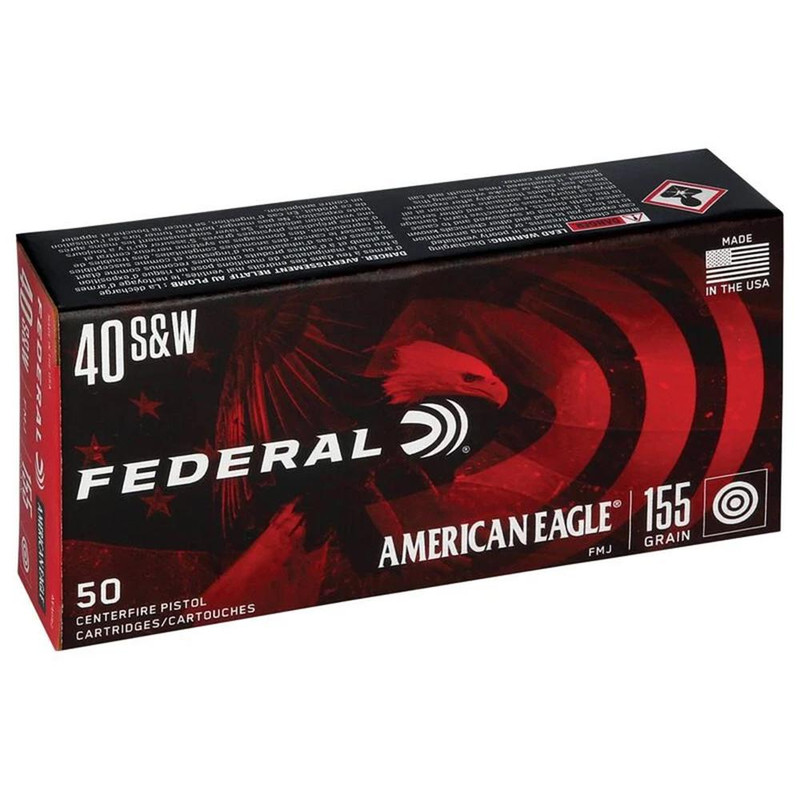 Federal American Eagle .40 S&W handgun ammunition loaded with 155 grain full metal jacket bullets at 1160 fps and 463 ft-lbs of energy. Features clean-burning powders, Federal primers, and brass cases suitable for target practice and training. Sold in bulk case quantities (1000 rounds, 20 boxes per case) and features reloadable brass casings.