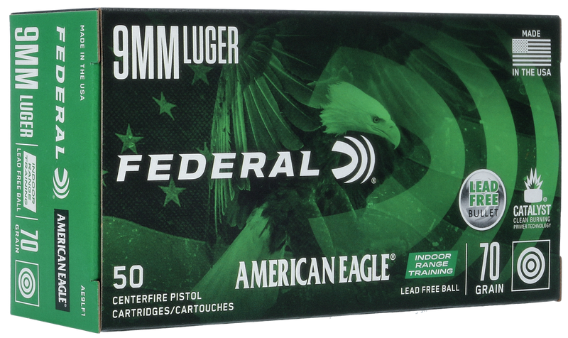 Federal American Eagle Indoor Range Training (IRT) ammunition in 9mm Luger with 70-grain lead-free bullets traveling at 1625 fps with 410 ft-lbs of muzzle energy. This fully encapsulated copper-jacketed round features Federal's Catalyst lead-free primer for reliable performance and safer indoor range use without airborne lead hazards.