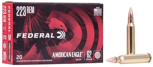 Federal American Eagle .223 Remington rifle ammunition with 75-grain Total Metal Jacket bullets delivers 2775 fps muzzle velocity and 1282 ft-lbs of energy. Features reloadable brass cases, consistent Boxer primers, and dependable performance for target shooting and practice.