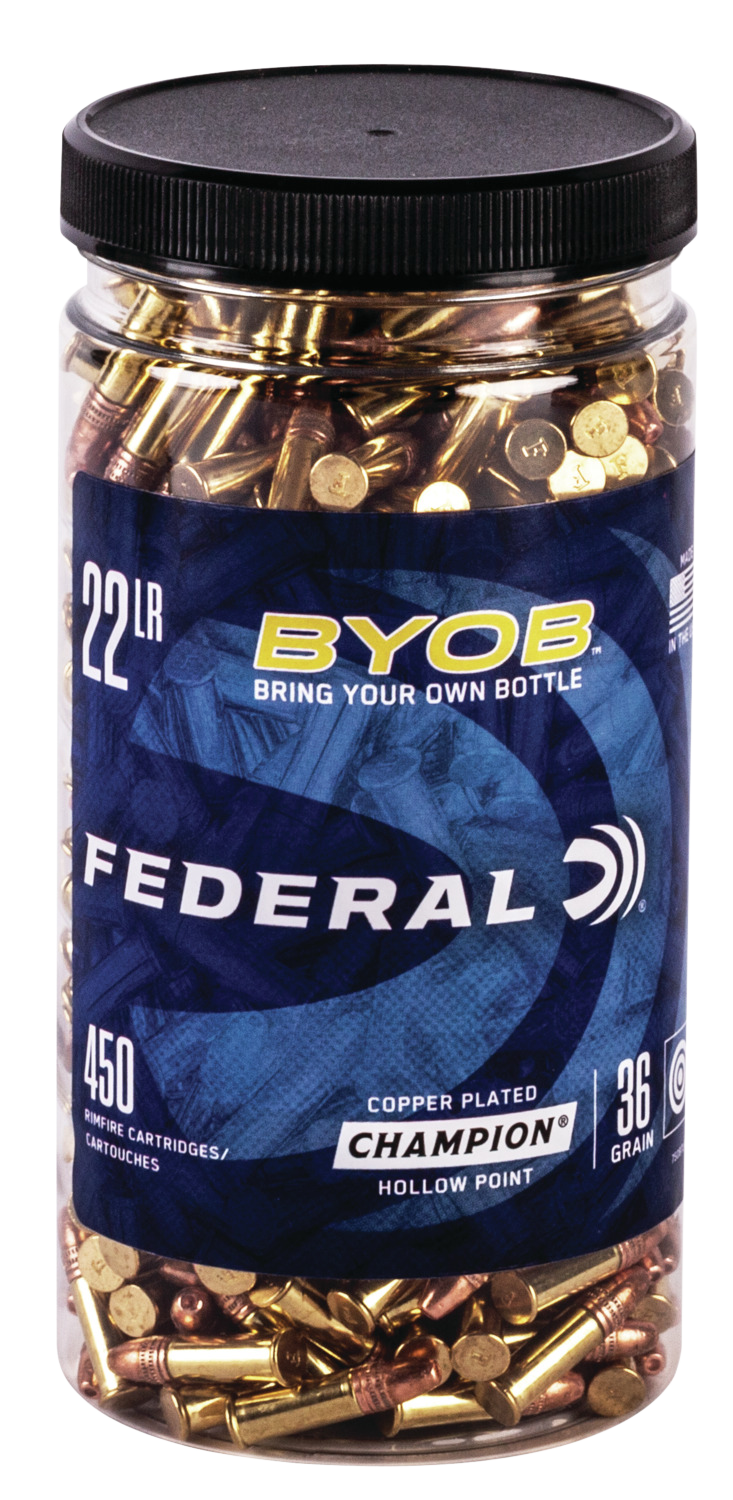 Federal Champion BYOB rimfire ammunition in .22 LR features 36-grain copper plated hollow point bullets loaded to 1260 fps in reloadable brass cases. This 450-round bucket is designed for affordable range training, plinking, and target shooting with reliable performance across a variety of rimfire applications.
