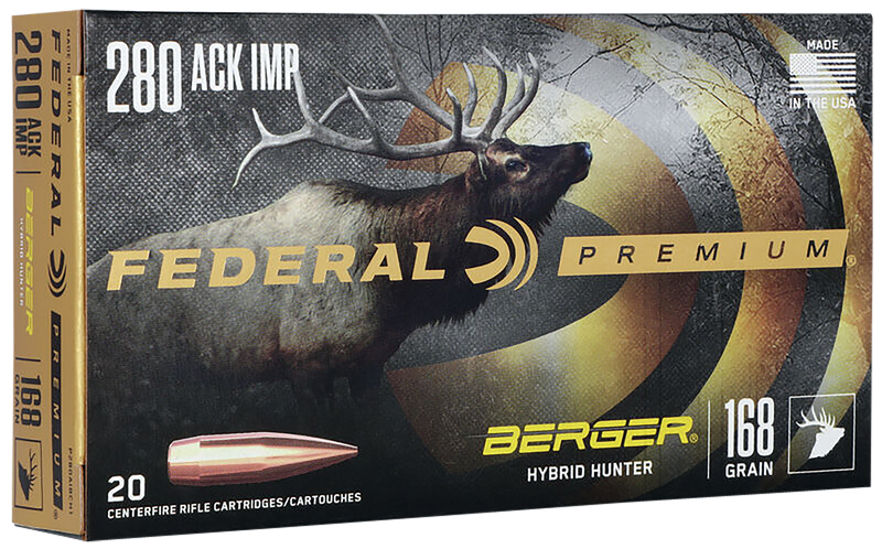 Federal Premium ammunition in 280 Ackley Improved with 168-grain Berger Hybrid Hunter bullets, loaded to 2800 fps with 2924 ft-lbs of muzzle energy. The Berger Hybrid Hunter design combines low-drag match bullet profiles with traditional hunting projectile performance for accuracy and terminal performance. Comes in 20-round boxes with nickel-plated brass cases.