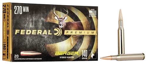 Federal Premium 6.5 Creedmoor ammunition loaded with 135 grain Berger Hybrid Hunter bullets. This round delivers 2775 fps muzzle velocity and 2308 ft-lbs of energy from a nickel-plated brass casing, designed for hunting applications with exceptional accuracy through factory rifles.