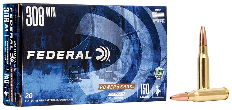 Federal Power-Shok Copper rifle ammunition in .308 Winchester with 150-grain copper hollow-point bullets. Delivers 2820 fps muzzle velocity and 2648 ft-lbs of energy with California-certified non-lead, lead-free construction. Features Catalyst lead-free primer for reliable ignition and reloadable brass casing.