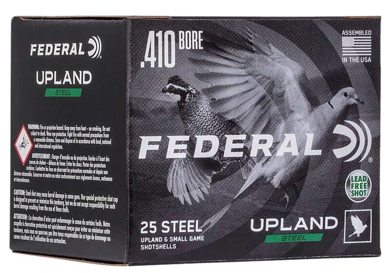Federal Upland Field & Range shotshells are loaded with steel shot in 410 gauge, 3" shells containing 3/8 oz of #7.5 shot designed for upland bird hunting and range shooting. These plastic-cased rounds achieve a muzzle velocity of 1400 fps, making them suitable for hunting small game birds at moderate distances.