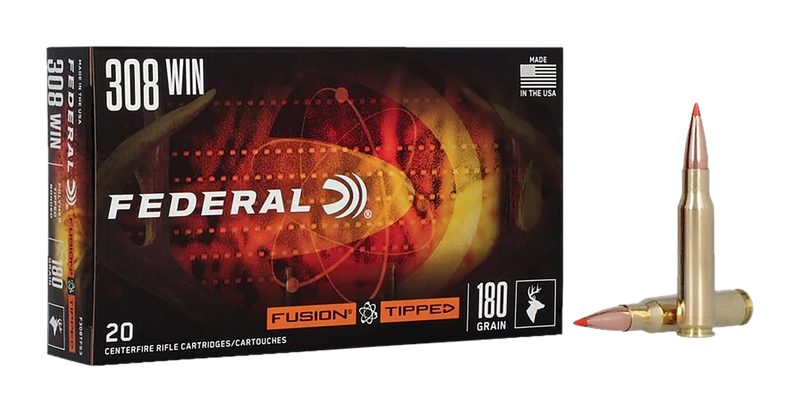 Federal Fusion Tipped rifle ammunition in .308 Winchester with 180-grain bonded soft point bullets delivering 2600 fps muzzle velocity. Features a polymer-tipped design that increases ballistic coefficient and improves accuracy while maintaining the pressure-formed lead core molecularly bonded to a copper jacket for superior weight retention and penetration. Packaged 20 rounds per box, 10 boxes per case.